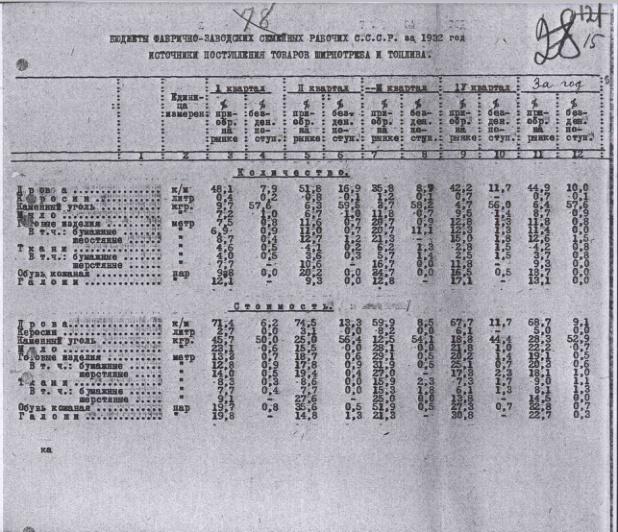 Бюджеты фабрично-заводских семейных рабочих СССР. Источники поступления товаров ширпотреба и топлива в 1932-1933 гг.
