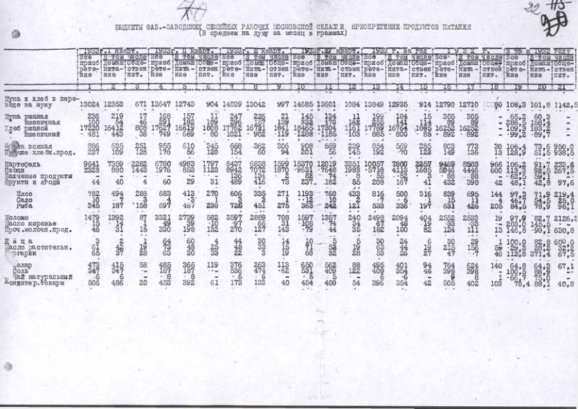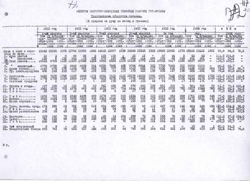 Бюджеты фабрично-заводских семейных рабочих Московской области. Приобретение продуктов питания в 1932-1933 гг.