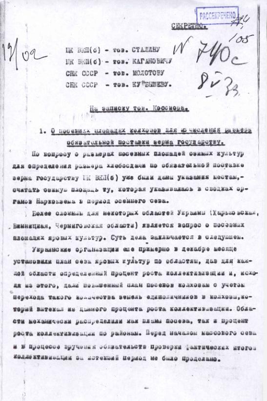 Ответ председателя комитета по заготовкам сельхозпродуктов при СНК СССР М.А. Чернова на записку Косиора об обязательных поставках. 7 мая 1933 г.