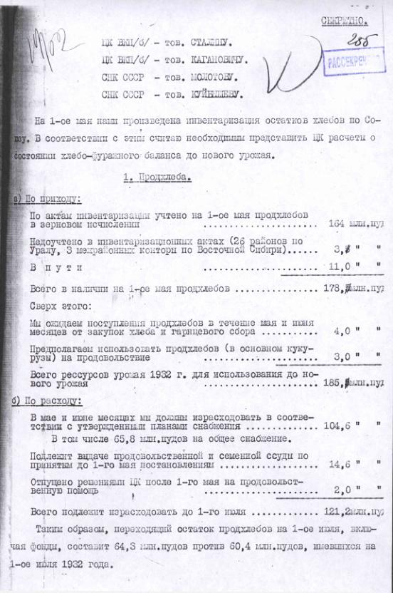 Справка о наличии хлеба на 1 мая 1933 года и расчет хлебофуражного баланса до следующего урожая с приложениями. 3 июня 1933 г.