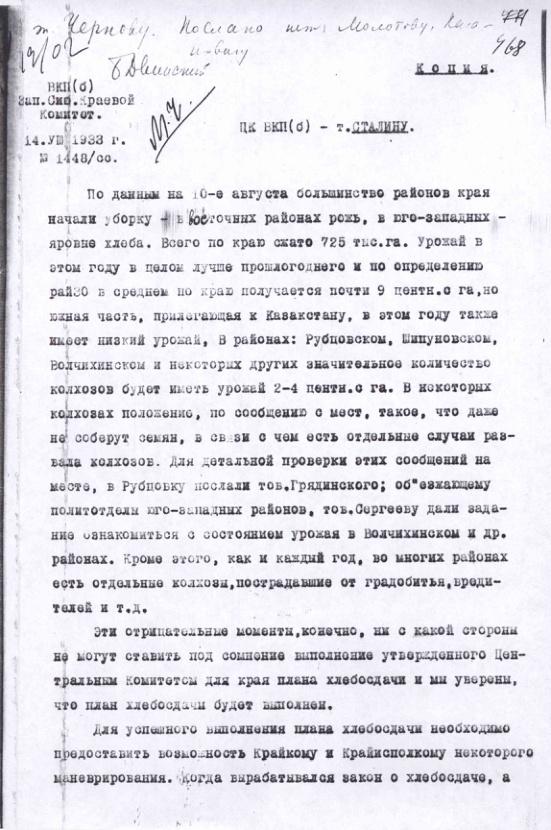 Записка секретаря Запсибрайкома ВКП(б) Эйхе с просьбой о возможности предоставлении возможности скидки для колхозов и районов находящихся в бедственном положении. 14 августа 1933 г.