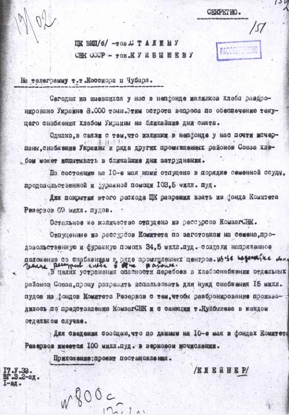 Предложение члена комитета по заготовкам сельхозпродуктов СНК СССР И.М.Клейнера о возможности выделения продовольствия из фондов Комитета Резервов. 17 мая 1933 г.
