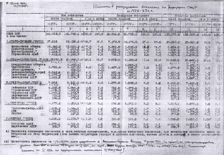 Изменение в распределении населения по территории СССР за 1926-1933 гг. 16 марта 1934 г.
