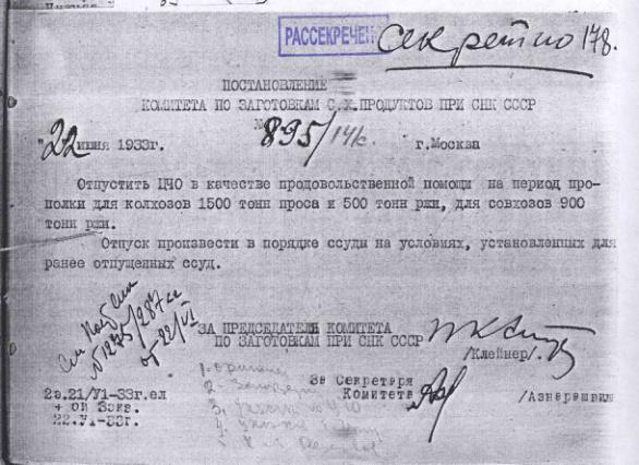 Постановление № 895/141с Комитета по заготовкам при СНК о выделении продовольственной помощи ЦЧО. 22 июня 1933 г.