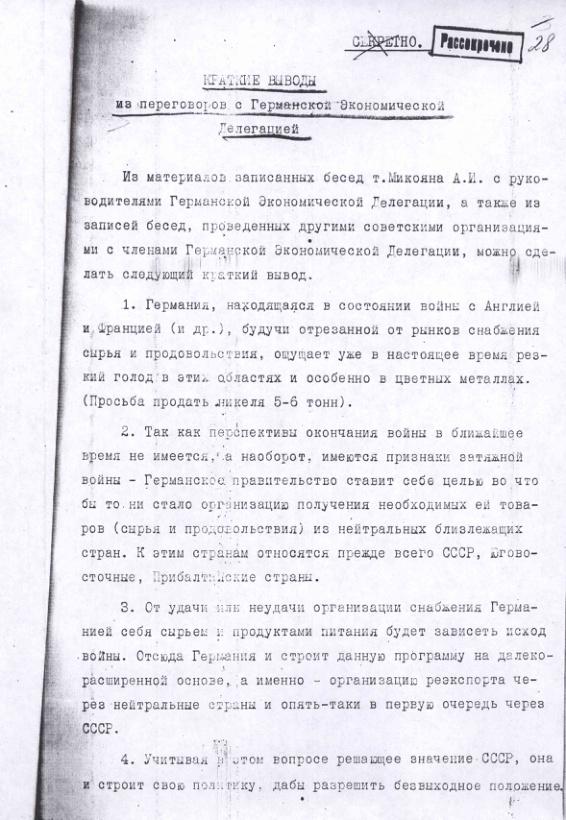 Краткие выводы из переговоров с германской экономической делегацией. 17 октября 1939 г.