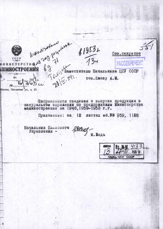Сведения о выпуске продукции на предприятиях министерства машиностроения за 1940, 1950-1953 гг.