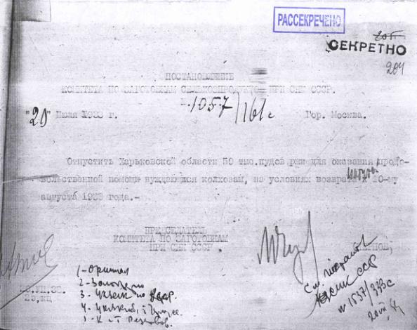 Постановление № 1057/161с Комитета по заготовкам при СНК об оказании продовольственной помощи УССР 20 июля 1933 г.