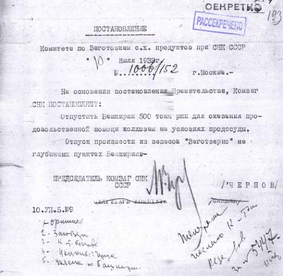 Постановление № 1006/152с Комитета по заготовкам при СНК об оказании продовольственной помощи Башкирии. 10 июля 1933 г.