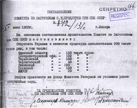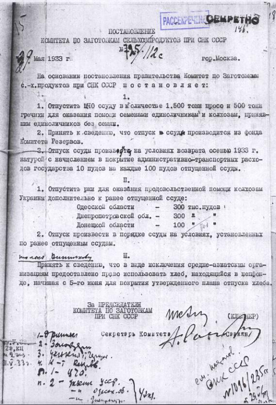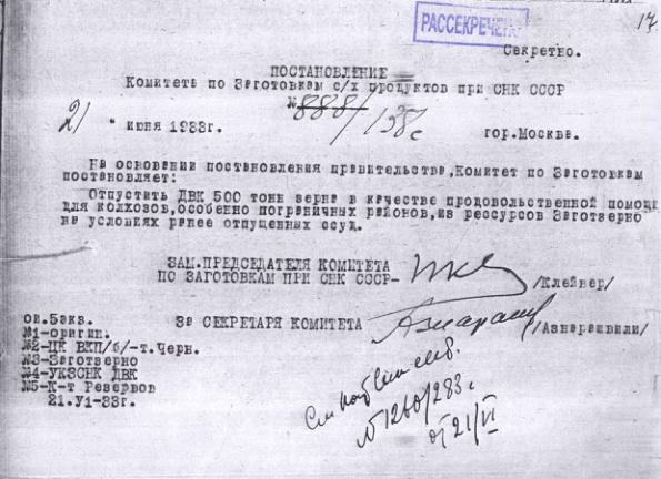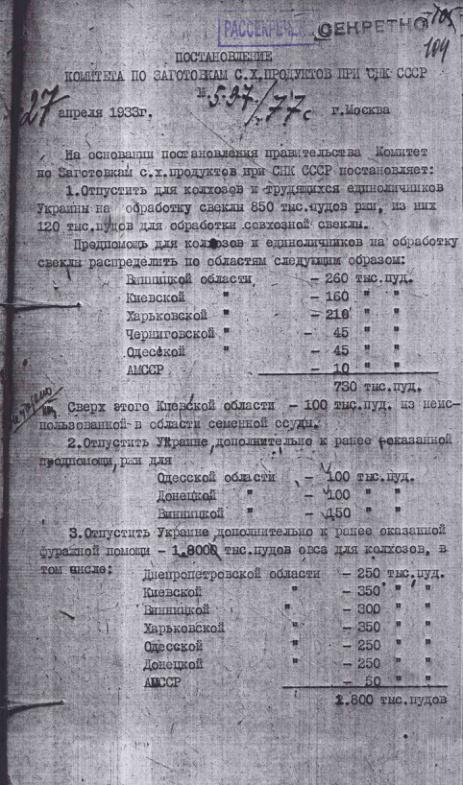 Постановление № 597/77с Комитета по заготовкам сельхозпродуктов при СНК об оказании продовольственной помощи УССР. 27 апреля 1933 г.
