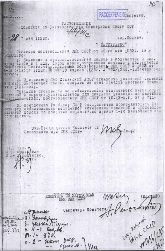 Распоряжение № 150/111с Комитета по заготовкам сельхозпродуктов при СНК о во продовольственной помощи Казахстану. 28 мая 1933 г.