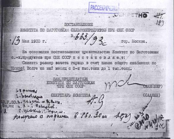 Постановление № 663/93с Комитета по заготовкам сельхозпродуктов при СНК о снижении размера гарнца для Нижне-Волжского края. 13 мая 1933 г.