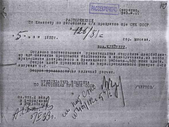 Распоряжение № 126/81с Комитета по заготовкам сельхозпродуктов при СНК о во продовольственной помощи Азербайджану. 5 мая 1933 г.