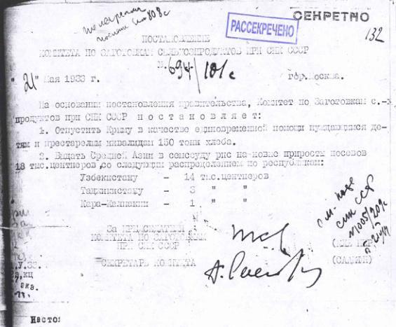 Постановление № 694/101с Комитета по заготовкам при СНК об оказании продовольственной помощи Крыму и выделению семенной ссуды для Средней Азии. 21 мая 1933 г.