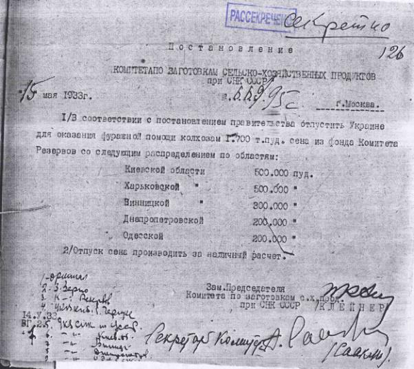 Постановление № 669/95с Комитета по заготовкам сельхозпродуктов при СНК об оказании фуражной помощи УССР. 15 мая 1933 г.