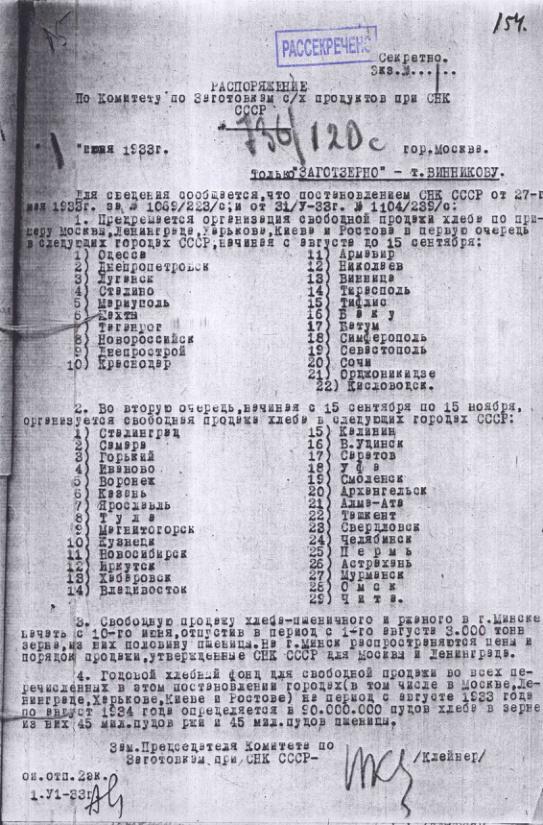 Распоряжение № 736/120с Комитета по заготовкам сельхозпродуктов при СНК о предстоящей организации свободной продажи хлеба в городах СССР. 1 июня 1933 г.