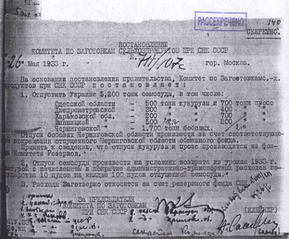 Постановление № 711/107с Комитета по заготовкам сельхозпродуктов при СНК о выделении семенной ссуды УССР. 26 мая 1933 г.
