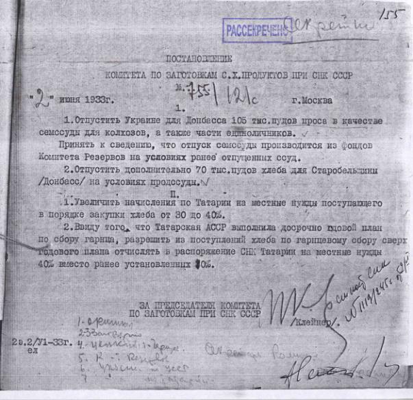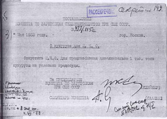 Постановление № 733/115с Комитета по заготовкам сельхозпродуктов при СНК о выделении продовольственной ссуды ЦЧО. 31 мая 1933 г.