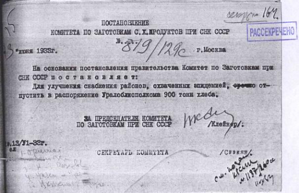 Постановление № 819/129с Комитета по заготовкам при СНК о выделении продовольственной помощи Уральской области. 13 июня 1933 г.