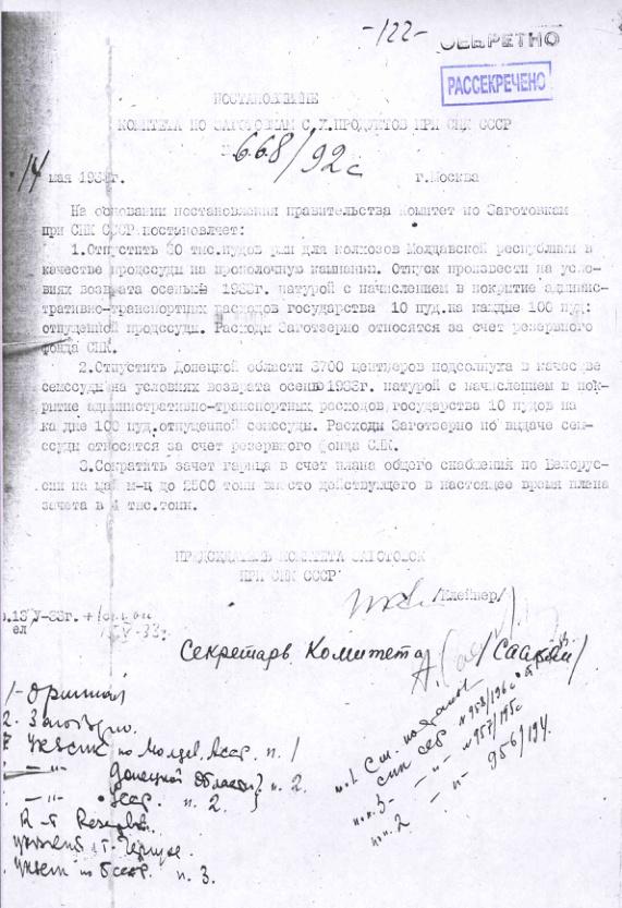 Постановление № 668/92с Комитета по заготовкам сельхозпродуктов при СНК о выделении продовольственной ссуды Молдавской республике. 14 мая 1933 г.