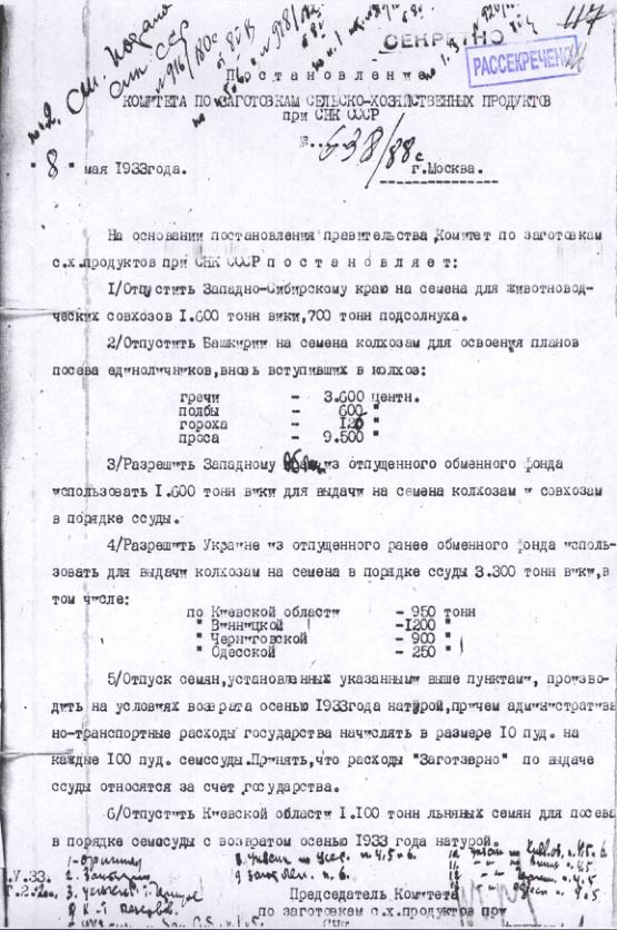 Постановление № 638/88с Комитета по заготовкам при СНК о семенных ссудах Зап. Сибирскому краю, Башкирии, УССР, Западной и Кировским областям. 8 мая 1933 г.