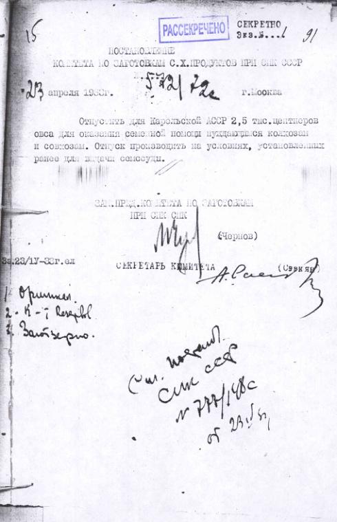 Постановление № 572/72с Комитета по заготовкам сельхозпродуктов при СНК об отпуске семенной помощи Карельской АССР. 23 апреля 1933 г.
