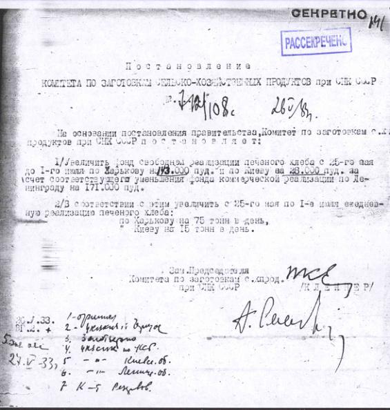 Постановление № 712/108с Комитета по заготовкам сельхозпродуктов при СНК об увеличении фонда свободной реализации печеного хлеба в Харькове и Киеве. 26 мая 1933 г.