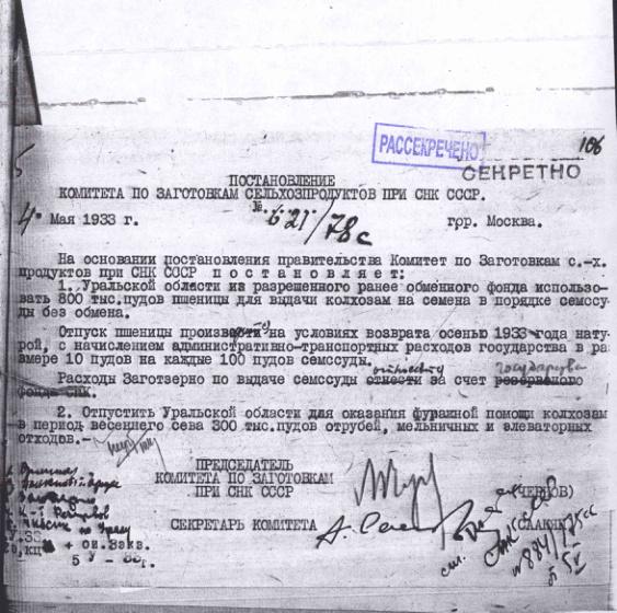 Постановление № 621/78с Комитета по заготовкам сельхозпродуктов при СНК о выделении семенной ссуды Уральской области. 4 мая 1933 г.