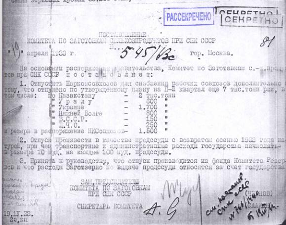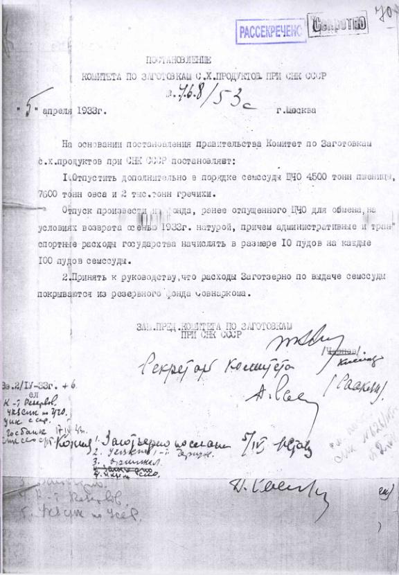 Постановление № 555/68с Комитета по заготовкам сельхозпродуктов при СНК об оказании продовольственной помощи Северному Кавказу и УССР. 21 апреля 1933 г