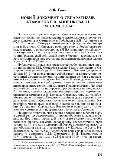 Новый документ о сепаратизме атаманов Б.В. Анненкова и Г.М. Семенова