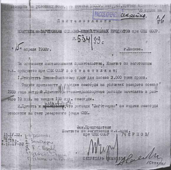 Постановление № 534/59с Комитета по заготовкам сельхозпродуктов при СНК о выделении семенной ссуды Нижне-Волжскому Краю.15 апреля 1933 г.