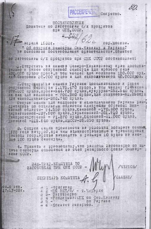 Постановление № 542/62с Комитета по заготовкам сельхозпродуктов при СНК об отпуске семенной ссуды Северному Кавказу и Украине. 17 апреля 1933 г.