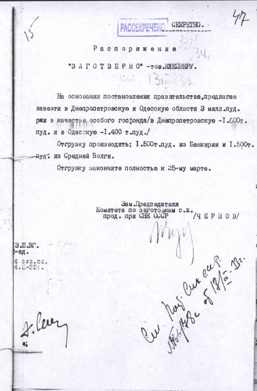 Распоряжение № 337/34с Комитета по заготовкам сельхозпродуктов при СНК о завозе 3 млн. пуд. ржи в УССР. 13 марта 1933 г.