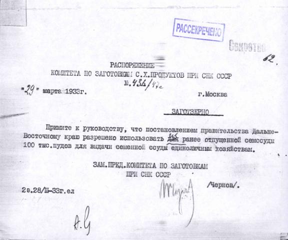 Распоряжение № 436/47с Комитета по заготовкам сельхозпродуктов при СНК о выделении семенной ссуды для Дальневосточного края. 29 марта 1933 г.