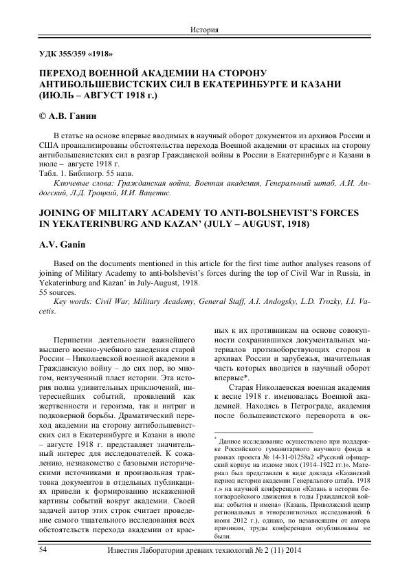 Переход Военной академии на сторону антибольшевистских сил в Екатеринбурге и Казани (июль - август 1918 г.)
