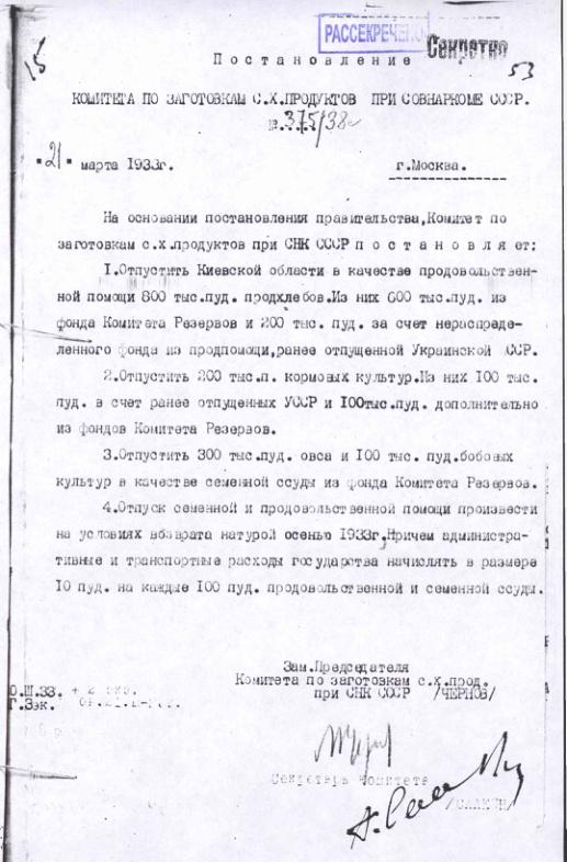 Постановление № 375/38с Комитета по заготовкам сельхозпродуктов при СНК об оказании продовольственной помощи УССР. 21 марта 1933 г.
