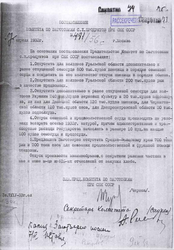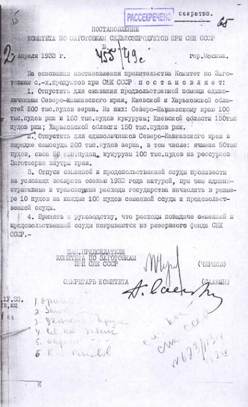 Постановление № 455/49с Комитета по заготовкам сельхозпродуктов при СНК об оказании продовольственной помощи единоличникам Северо-Кавказского Края и УССР. 2 апреля 1933 г.