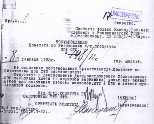 Постановление № 148/11с Комитета по заготовкам сельхозпродуктов при СТО об отпуске хлеба Днепропетровской области. 8 февраля 1933 г.