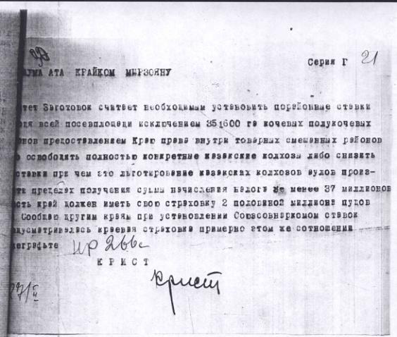 Телеграмма Комитета Заготовок первому секретарю Казахстанского крайкома ВКП(б) Л.И. Мирзояну об установлении порайонных ставок. 27 февраля 1933 г.