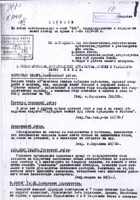 Выписки из писем командированных и информации заготовительных контор Комитета Заготовок с 1 по 10 февраля 1933 г.