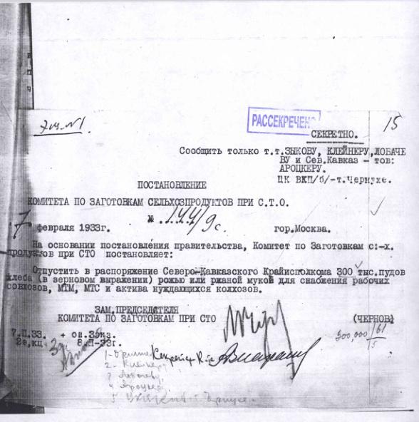 Постановление № 144/9с Комитета по заготовкам сельхозпродуктов при СТО об отпуске хлеба Северо-Кавказскому краю. 7 февраля 1933 г.