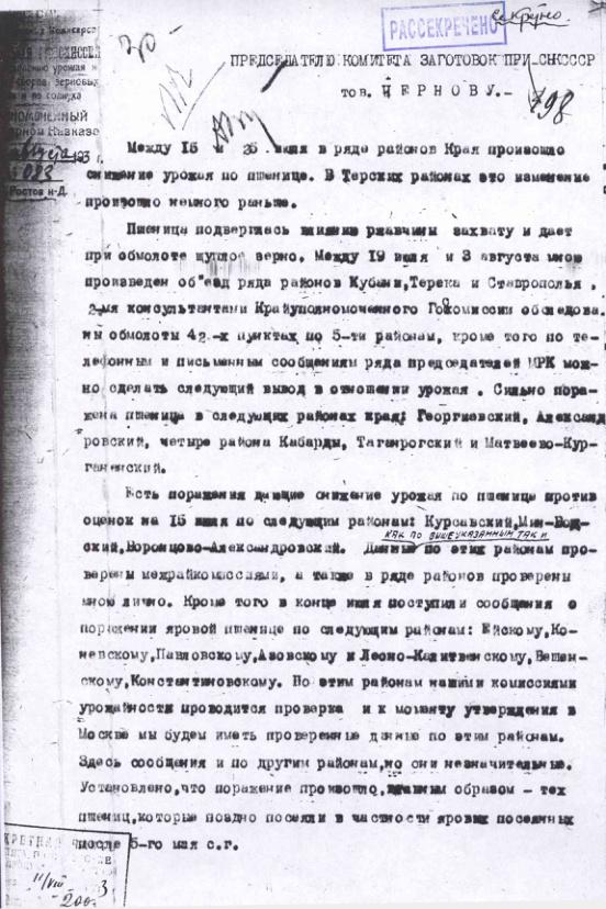 Записка уполномоченного Государственной комиссии по определению урожайности с оценкой урожая в период с 15 по 25 июля 1933 г. 11 августа 1933 г.