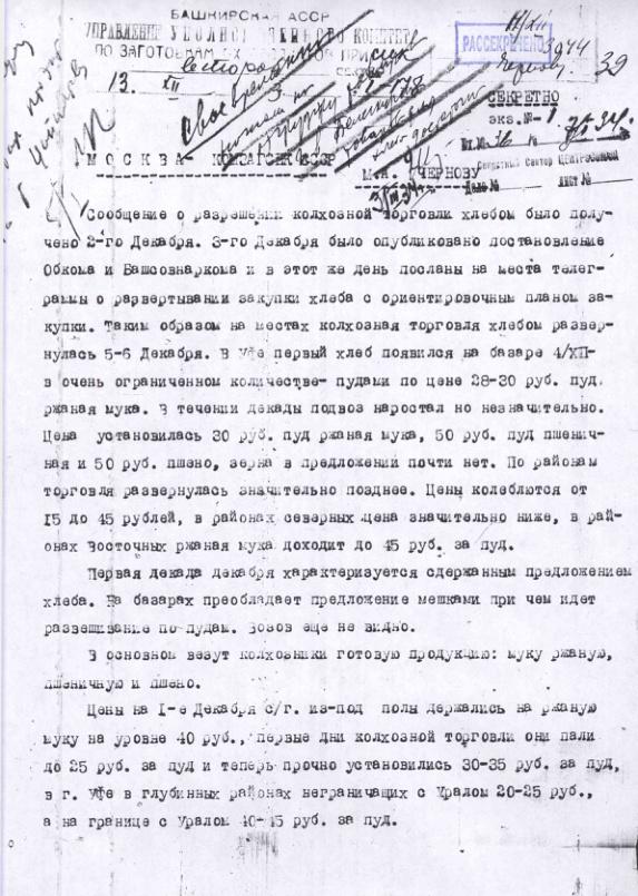 Сообщение о колхозной торговле хлебом в г. Уфе. 13 декабря 1933 г.