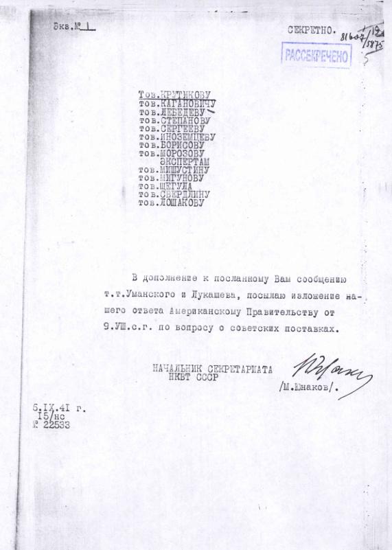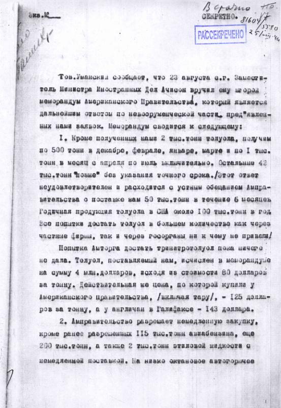 Сообщение Амторгу о позиции СССР в переговорах о возможности заключения торгово-кредитного соглашения с США. 6 сентября 1941 г.