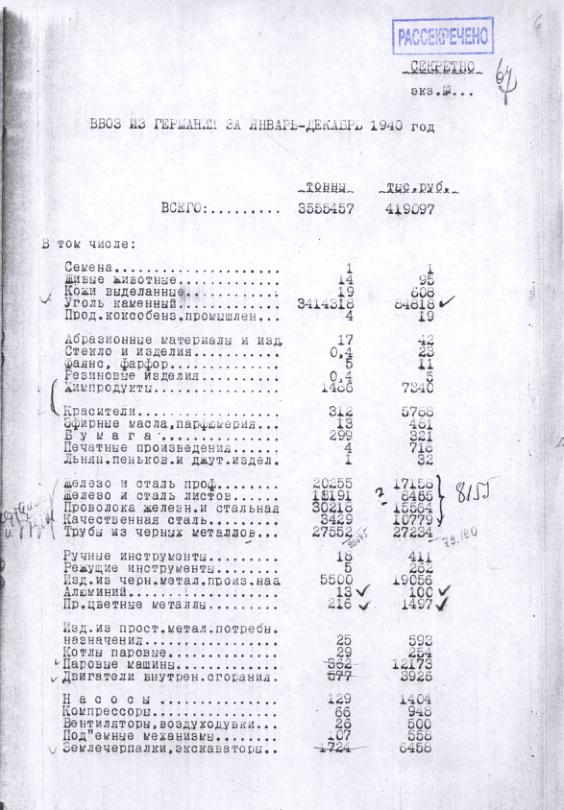 Справка о ввозе товаров в СССР из Германии за январь-декабрь 1940 года. 8 мая 1941 г.