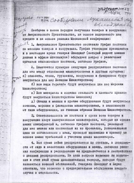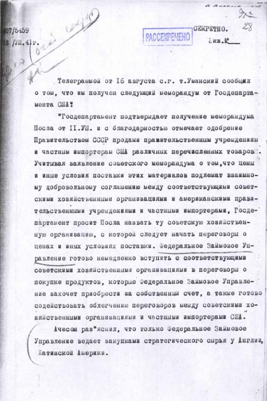 Сообщение об условиях получения кредита в США. 26 августа 1941 г.