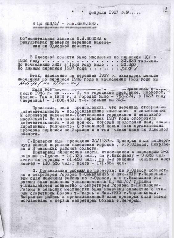 Объяснительная записка П.И.Попова о результатах проверки переписи населения 1937 года в Одесской области. Февраль 1937 г.