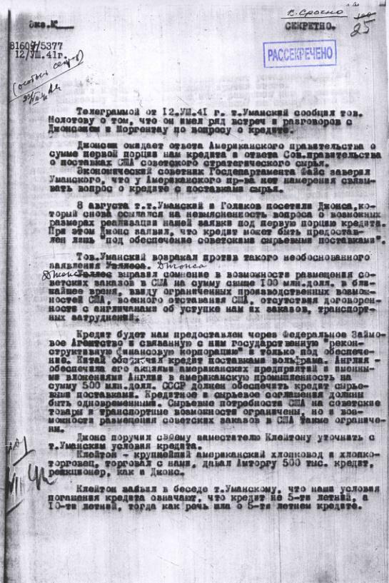 Сообщение о переговорах и возможности получения кредита в США. 12 августа 1941 г.