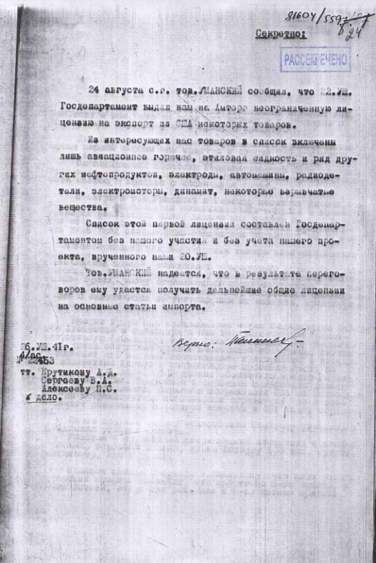 Сообщение о получении Меморандума Госдепартамента о разрешении импорта в США ряда товаров из СССР. 18 августа 1941 г.