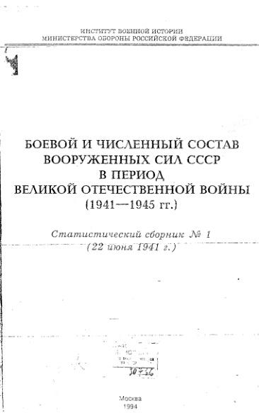 Боевой и численный состав вооруженных сил СССР в период Великой Отечественной Войны (1941-1945 гг.) Статистический сборник №1. (22 июня 1941 г.)