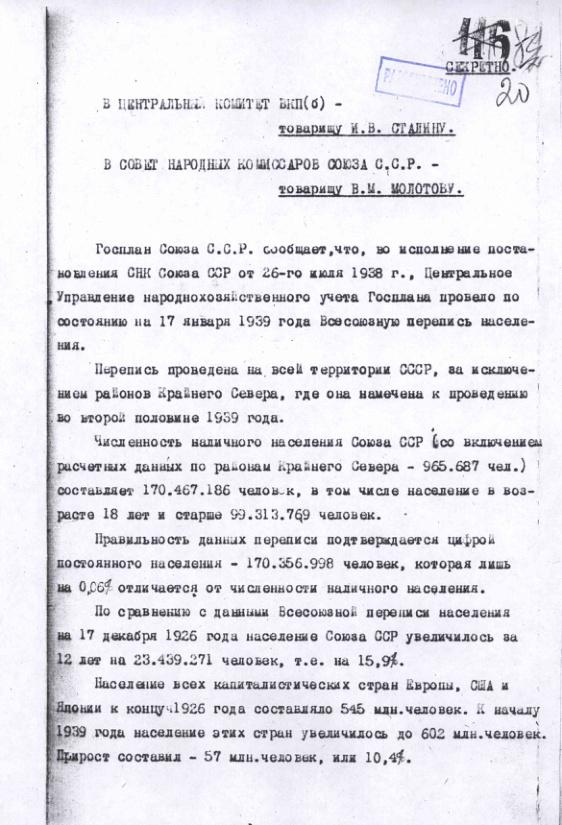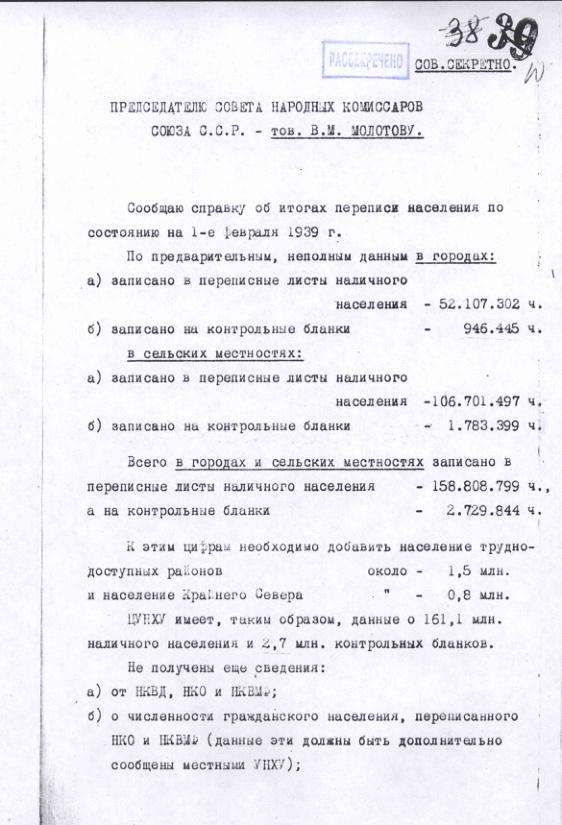 Справка ЦУНХУ на имя И.В.Сталина и В.М.Молотова предварительными итогами переписи населения 1939 года. Апрель 1939 г.